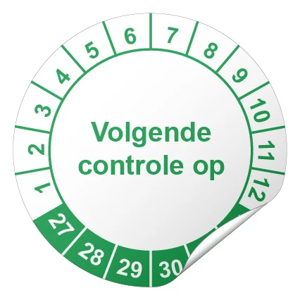 Keuringsstickers "Volgende controle op" zijn de ideale oplossing om duidelijk aan te geven wanneer een volgende inspectie of controle plaatsvindt. Deze ronde stickers zijn voorzien van maand- en jaarringen (maanden 1 t/m 12 en jaren 26 t/m 29) waarmee je eenvoudig de juiste datum markeert.